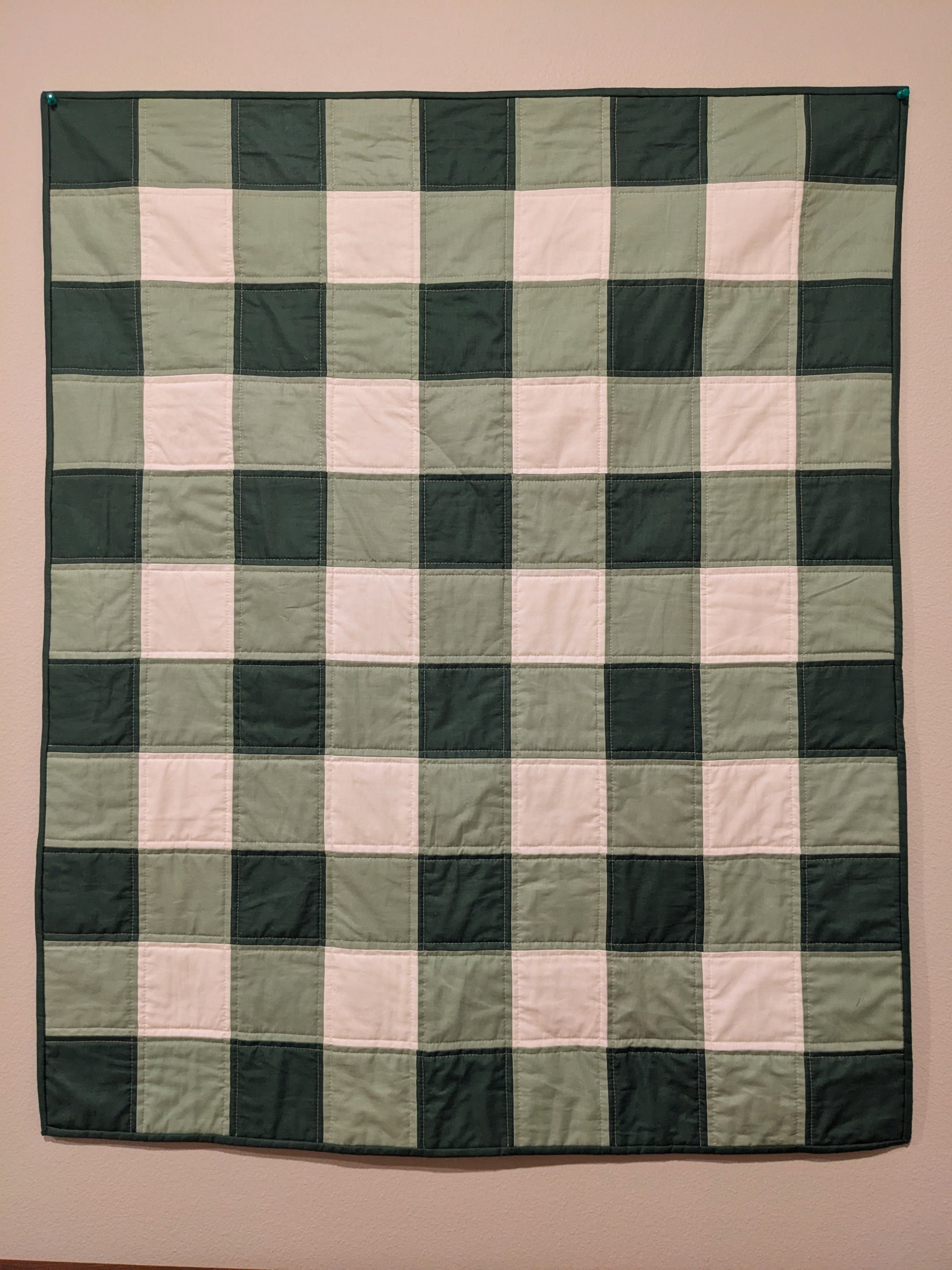 I made this pattern as a baby gift! The hardest part was picking the proper colors. I chose greens and white with navy for the baby’s name in appliqué on top. I didn’t quilt in straight lines because I was short on time but it still turned out great. When making the pattern I did sew strips together instead of all individual squares which was a time saver. I also used a cozy baby fabric backing which ended up being about 2in too narrow so I had to trim a full row from the top and side because out of laziness I didn’t want to piece the backing. Still turned out great but I’d keep it in mind for next time. Overall it’s a great beginner pattern. One problem I had is the image for piecing doesn’t match the wording. Figure A shows 5 A squares but the instructions say to use 6 A squares. Maybe this is why my quilt was too wide because I made it with 6 A squares. I think either the directions or the image need to be updated. I went by instructions not image unfortunately but it still looks cute!