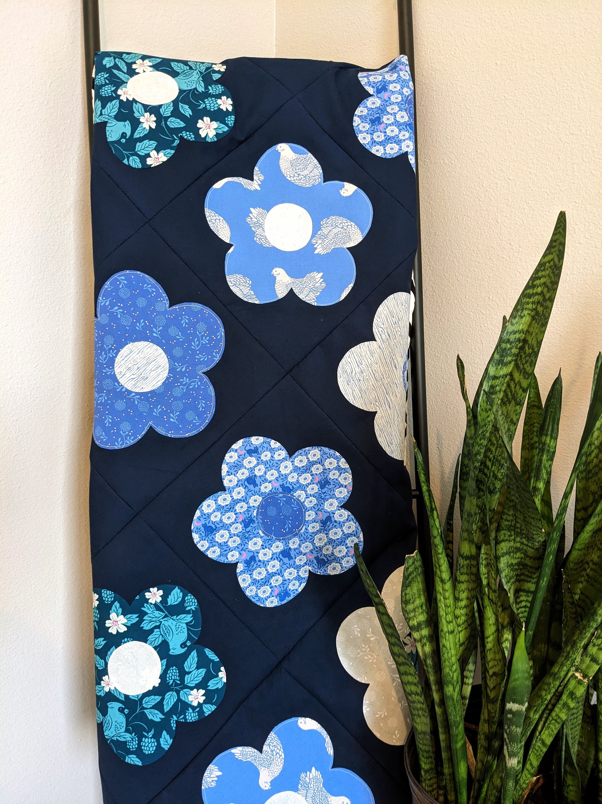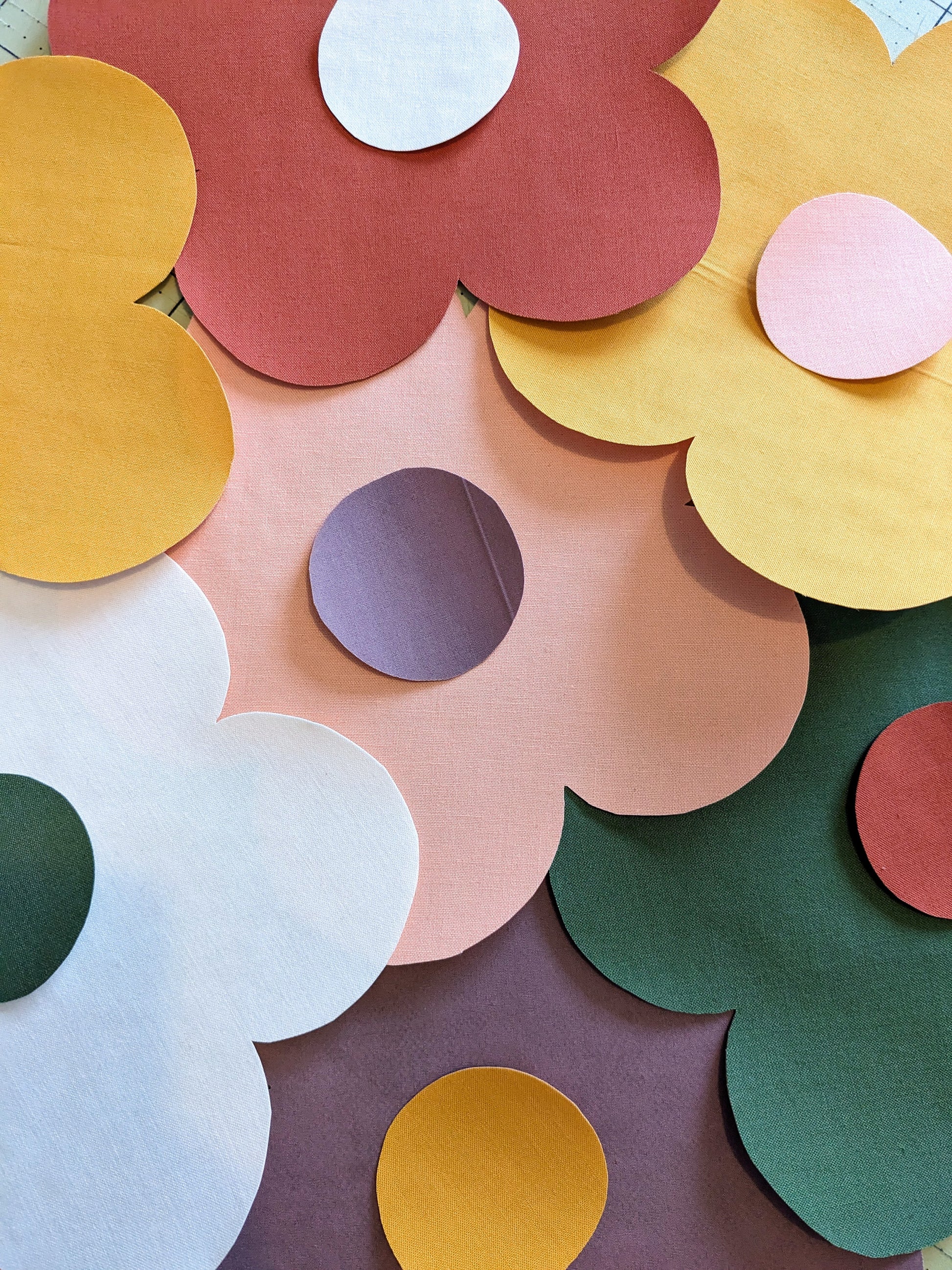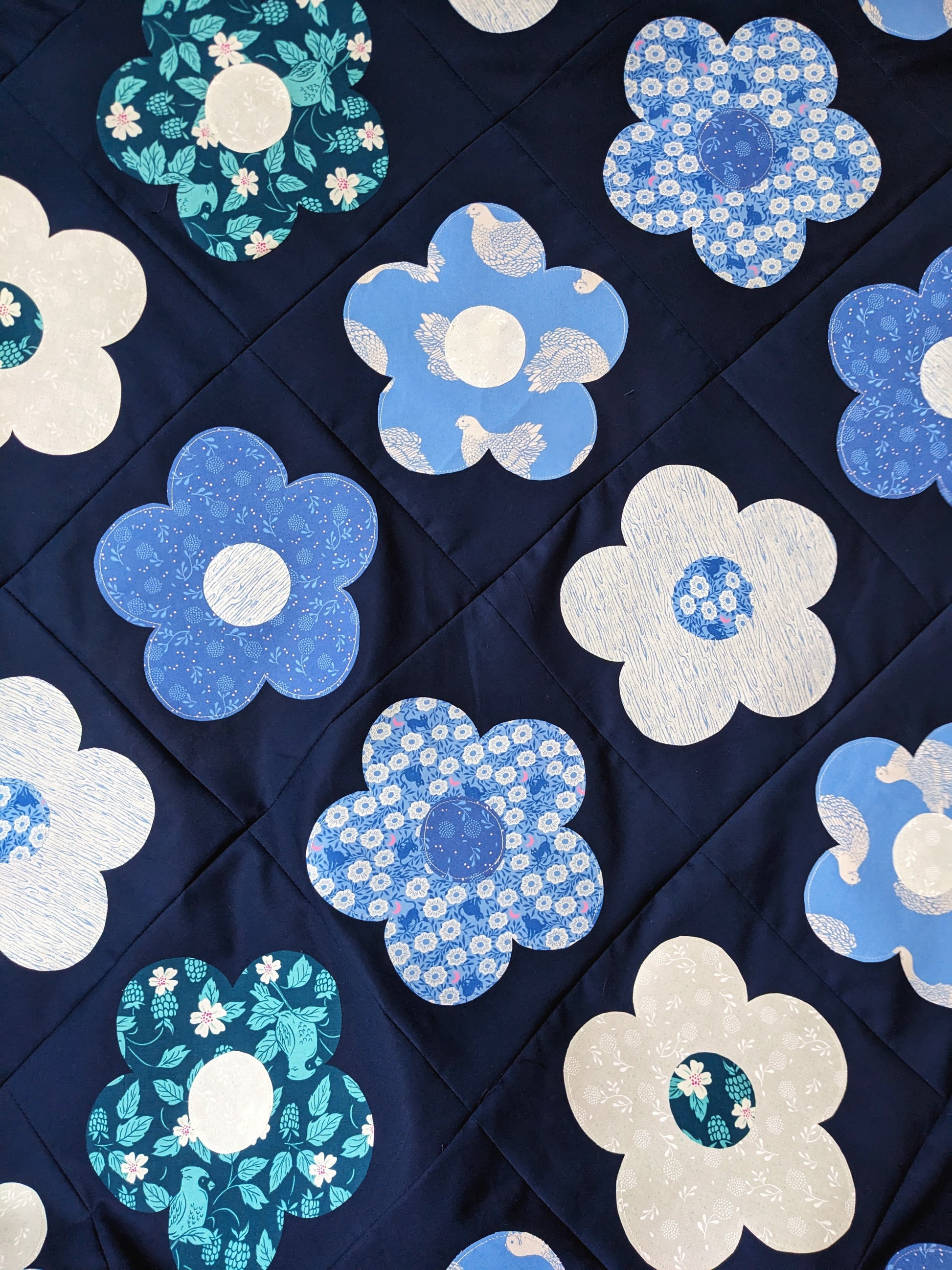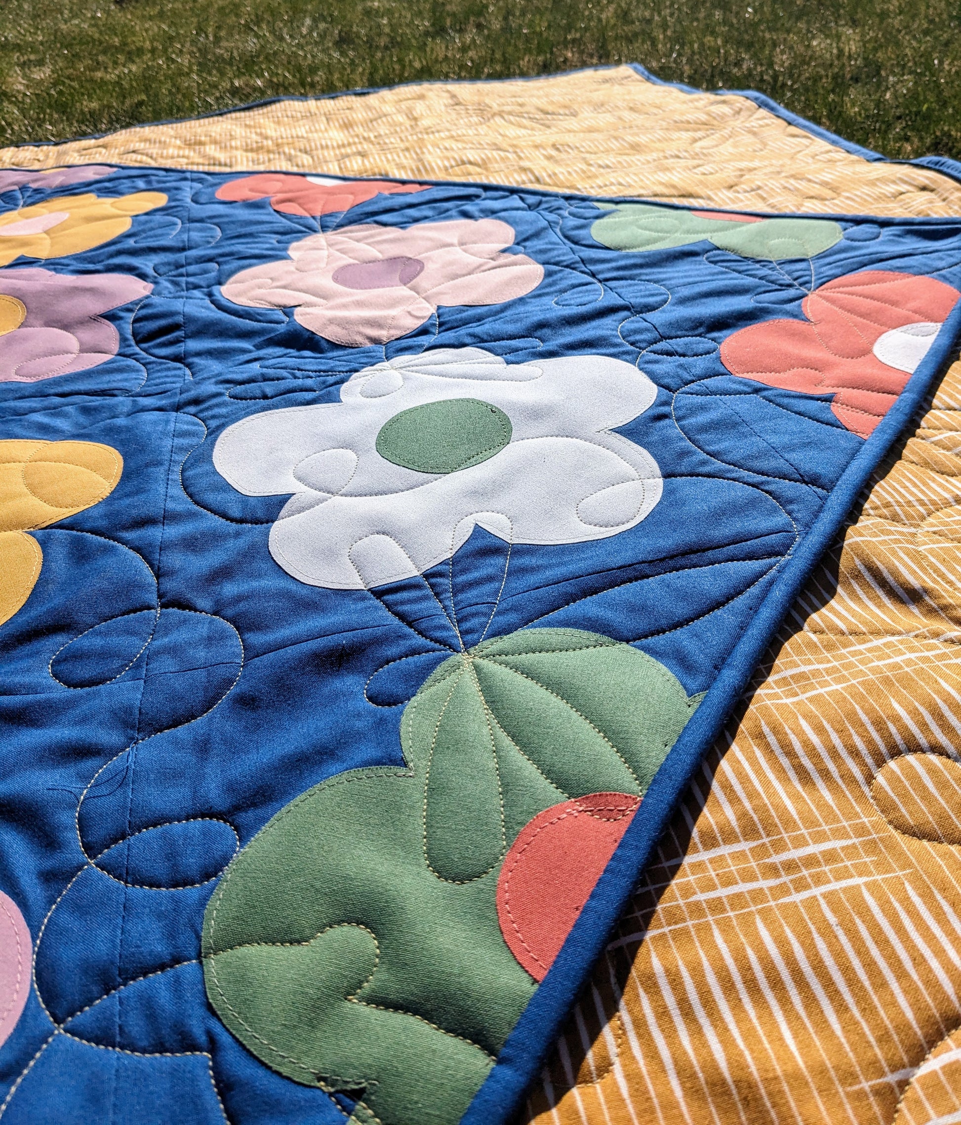 Nora's Garden quilt is a modern flower appliqué pattern! It uses raw edge appliqué on a sewing machine. I love the whimsical flowers that seem to dance on the quilt!